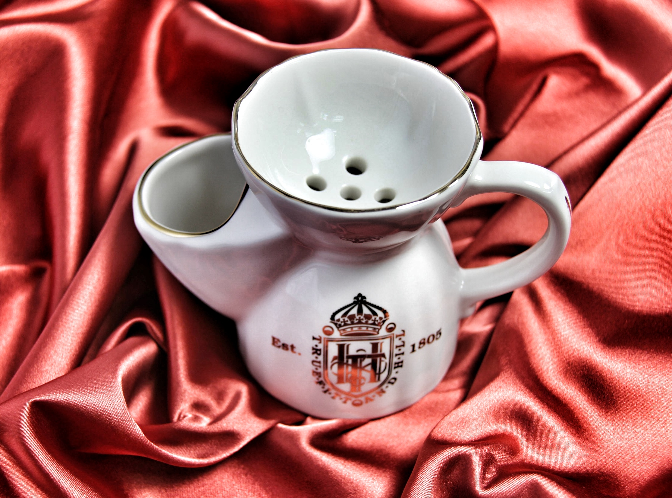 Изготавливается из дорогого костяного фарфора. Конусообразная фарфоровая кружка с ручкой и чашей для хранения мыла для бритья. Удобство использования обеспечивает носик, который позволяет легко сливать остатки скопившейся пены из кружки. Кружка прекрасно вписывается в интерьер ванной и позволяет сохранить мыло для бритья в идеальном состоянии. Мыло в комплекте.