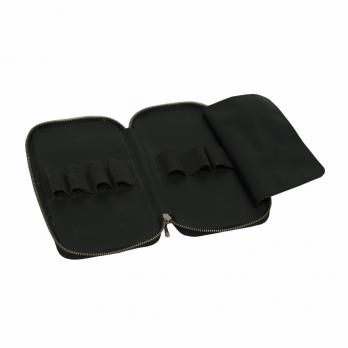 Сделан из мягкой кожи чёрного цвета, с твёрдыми, но гибкими, предположительно картонными, основаниями. Бритвы фиксируются резиновыми держателями. Закрывается на "молнию". Для исключения возможности соприкосновения бритв предусмотрена специальная кожаная "прокладка". В этом футляре можно хранить "недельный набор" бритв. Рекомендуем хранить в этом футляре бритвы не толще 9-10 мм (в закрытом состоянии).