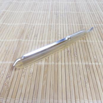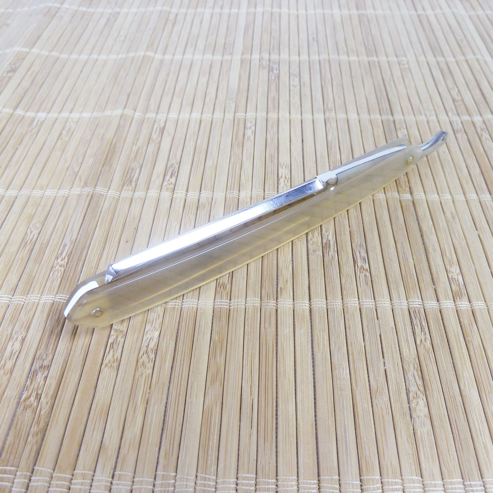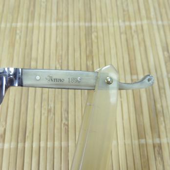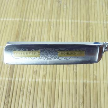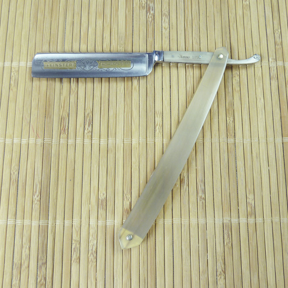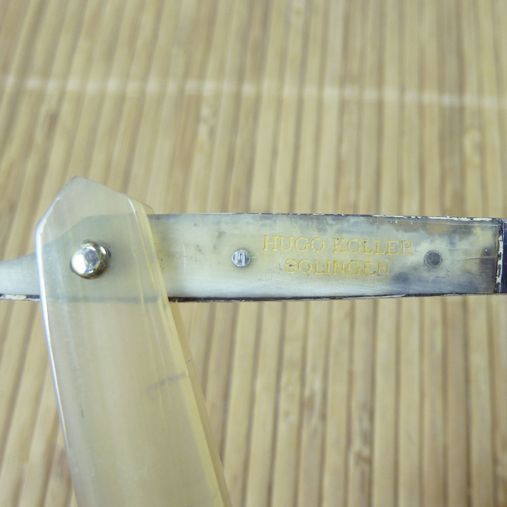 Ширина полотна 5/8", вогнутость 1/1, прямоугольная головка, углеродистая сталь, ручка из буйволиного рога. Клинок бритвы, по словам немецких коллекционеров, был изготовлен примерно в 1870-90 годах фирмой Hugo Koeller, о чём гласит надпись на обратной стороне эрля HUGO KOLLER SOLINGEN и на лицевой - Anno 1890 (пер.с нем. - в 1890 году). Бритва имеет необычное строение: хвостик с накладками из буйволиного рога и соединён с лезвием, обхватывая его сразу за основанием в области эрля. Полотно бритвы украшено травлением в виде герба города Золинген между слов FEINSTER HOHLSCHLIFF (пер. с нем. - "тончайшая вогнутая заточка"). Рукоять - буйволиный рог.