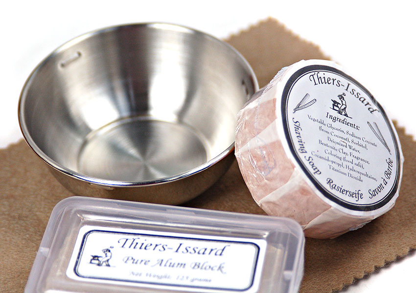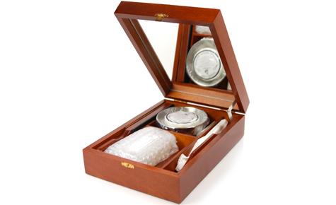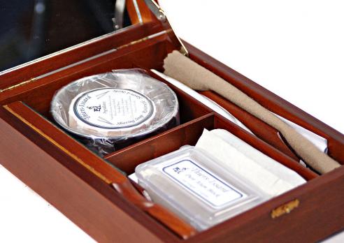 Элитный набор для бритья в деревянной шкатулке ручной работы, разработанной и произведённой фабрикой Thiers-Issard. Набор представляет собой воспроизведённую копию набора для любителя бритья опасной бритвой начала 20 века. Обладание таким набором в то время было показателем высочайшего статуса мужчины в обществе, он использовался как дома, так и в путешествиях. Настоящий набор джентльмена! В набор входят: металлическая чашечка для взбивания пены, мыло для бритья (84г. брутто), алюмокалиевые квасцы для остановки крови (125г.) в пластиковом футляре, двухсторонний мини-ремешок для правки, паста белая для полировки, 1 кисточка-помазок "Серебряный барсук" с ручкой из светлого рога, 1 опасная бритва BRUCKE Solingen шириной 6/8" с вогнутостью 1/1 с белой пластиковой ручкой. Предусмотрено 2 отделения для опасных бритв. Отдельного внимания заслуживает шкатулка. Изготовленная вручную из твердых пород дерева, она отлично подходит для хранения и транспортировки опасных бритв и аксессуаров для бритья. В крышку шкатулки вс