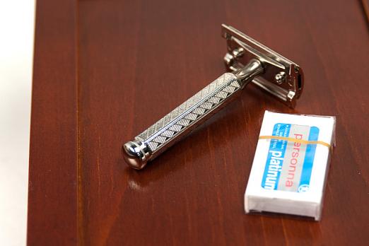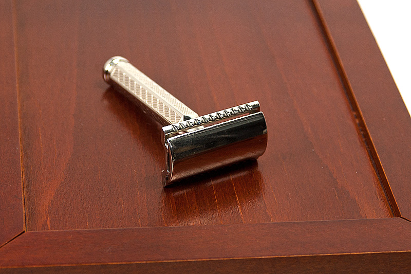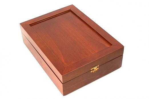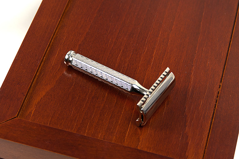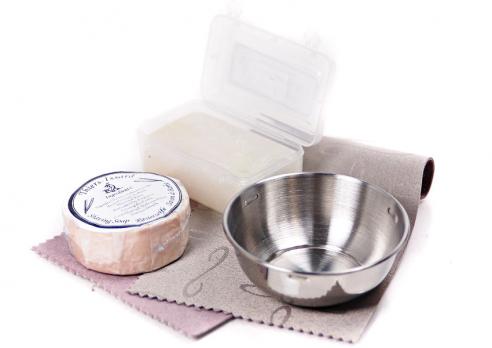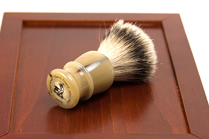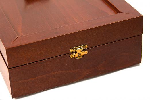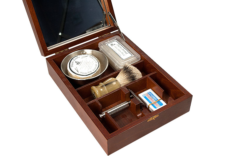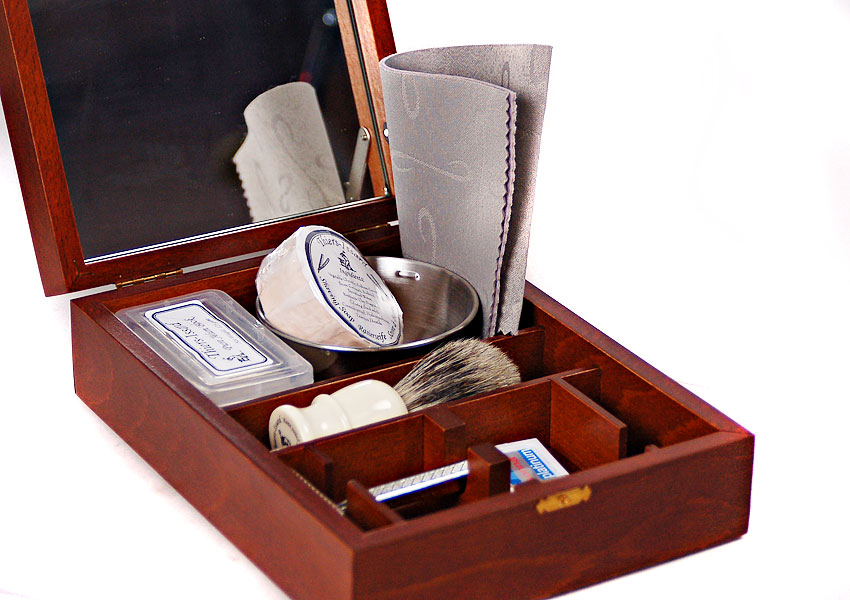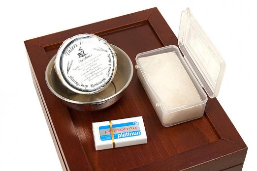 Элитный набор для бритья в деревянной шкатулке ручной работы, разработанной и произведённой фабрикой Thiers-Issard. Набор представляет собой воспроизведённую копию набора для любителя бритья Т-образным станком начала 20 века. Обладание таким набором в то время было показателем высочайшего статуса мужчины в обществе, он использовался как дома, так и в путешествиях. Настоящий набор джентльмена! В набор входят все необходимые для бритья и ухода за бритвой аксессуары: кисточка-помазок высокого качества с белой пластиковой ручкой, металлическая чашечка для взбивания пены, мыло для бритья (84г. брутто), алюмокалиевые квасцы для остановки крови (125г.) в пластиковом футляре, станoк для бритья Т-образный с головкой "прямой срез" и шестигранной резной ручкой и 1 упаковка лезвий Personna Platinum (10 шт.). Предусмотрено 2 отделения для Т-образных бритв, дополнительно можно поместить несколько упаковок лезвий. Отдельного внимания заслуживает шкатулка. Изготовленная вручную из твердых пород дерева, она отлично подходит д