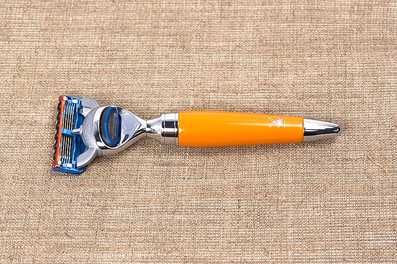 Станок адаптирован под бритвенную систему Gillette Fusion, ручка из высококачественной смолы оранжевого цвета/хромированного металла