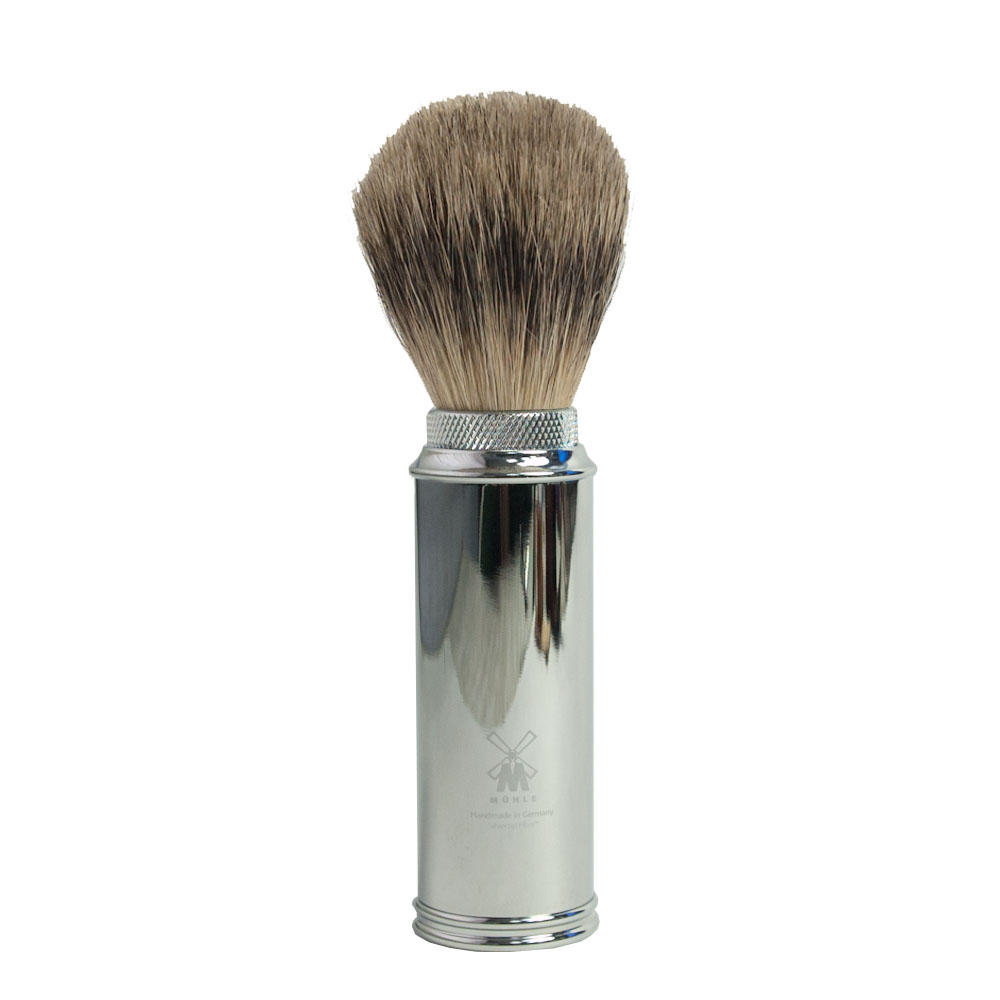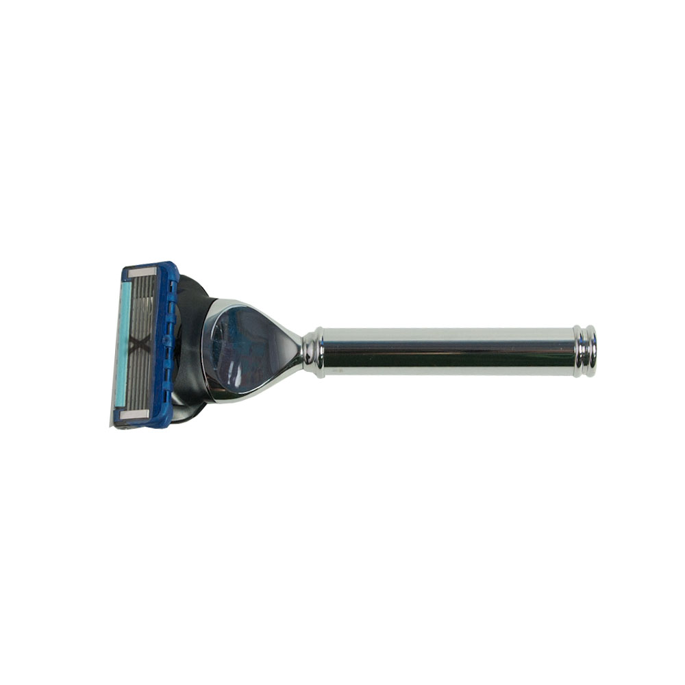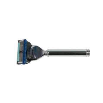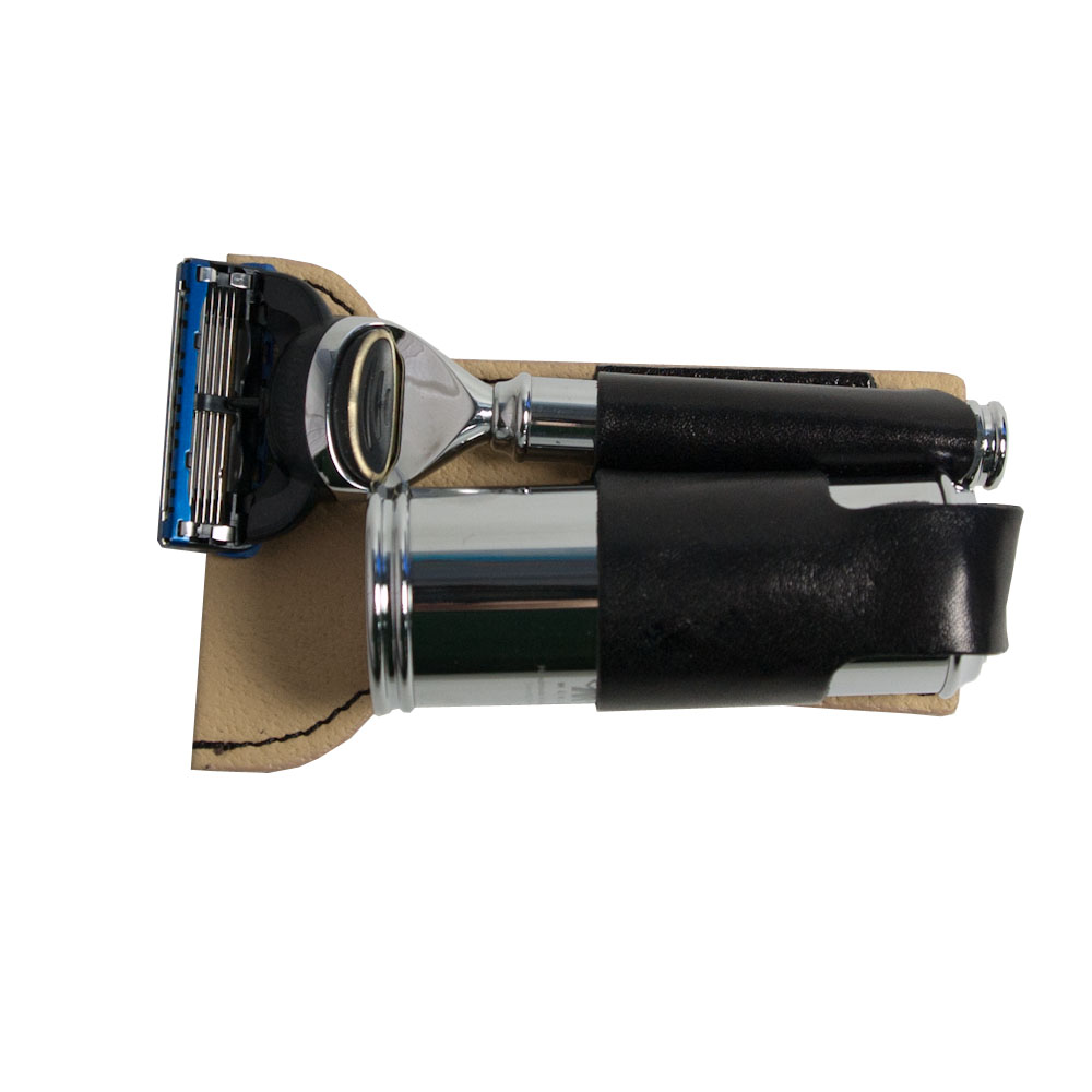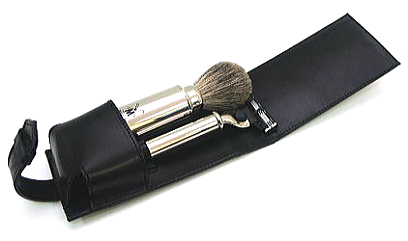 Высококачественный элитный бритвенный набор в черном кожаном футляре, адаптированный под бритвенную систему Gillette MACH3. В комплекте: станок для бритья, изготовленный из никелированной стали, кисточка - помазок для бритья из щетины барсука с никелированной разборной ручкой. Ручка трансформируется в футляр для хранения помазка