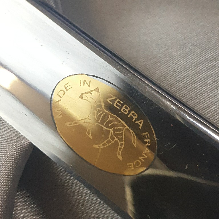 Надпись на лезвии: "ZEBRA" (изготовлено электрохимическим способом с позолотой)