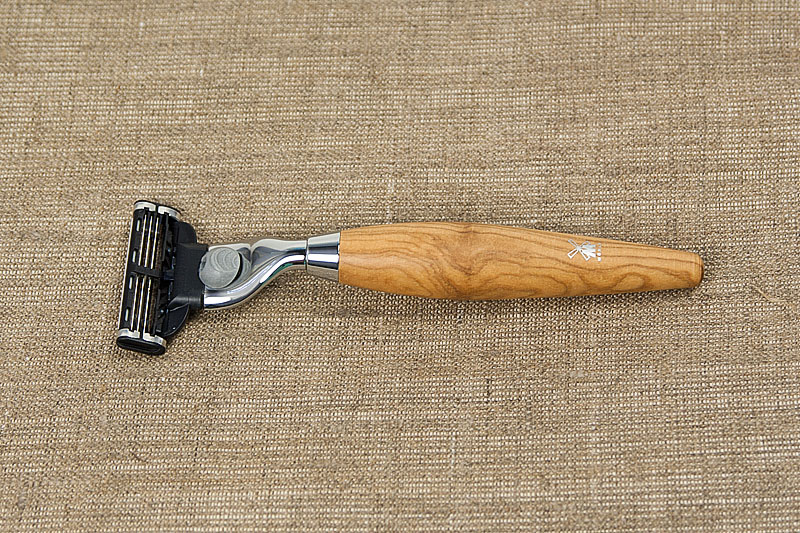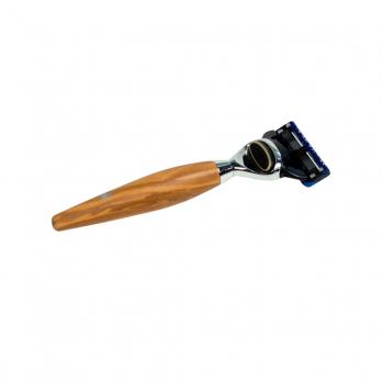 Станок адаптирован под бритвенную систему Gillette Mach3, с ручкой из оливкового дерева.
